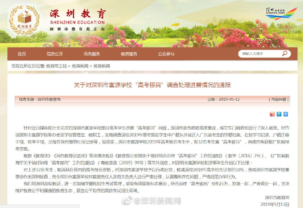 針對(duì)近日媒體和社會(huì)關(guān)注的深圳市富源學(xué)校部分高考學(xué)生涉嫌“高考移民”問(wèn)題,深圳市委市政府高度重視,成立專門(mén)調(diào)查組進(jìn)行了深入調(diào)查。經(jīng)約談深圳市富源學(xué)校舉辦者及學(xué)校管理層、教職工,實(shí)地調(diào)查該校2019年高考報(bào)名學(xué)生中戶籍從外省遷入廣東省考生的學(xué)籍檔案、在校學(xué)習(xí)記錄、戶籍遷移手續(xù)、轉(zhuǎn)學(xué)手續(xù)、父母在我市繳納社保記錄等,現(xiàn)查實(shí),深圳市富源學(xué)校2019年高考報(bào)名考生中,有32名考生屬“高考移民”,弄虛作假獲取廣東省報(bào)考資格。