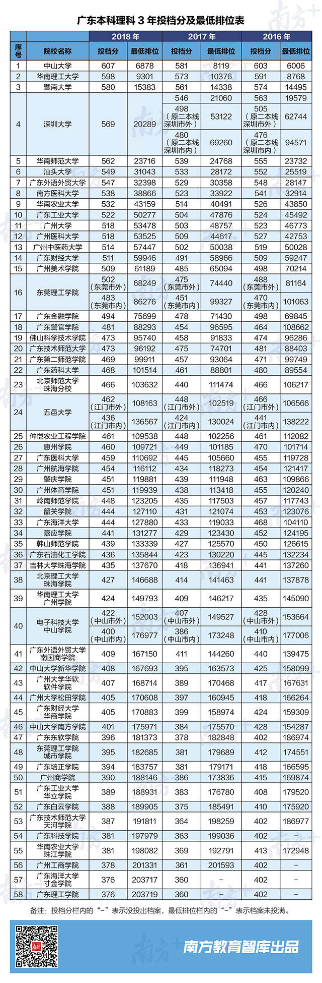 南方教育智庫獨(dú)家統(tǒng)計了2016-2018共3年廣東高校錄取分和最低排位,為廣東考生全面分析,排位多少名,能上廣東好大學(xué)?