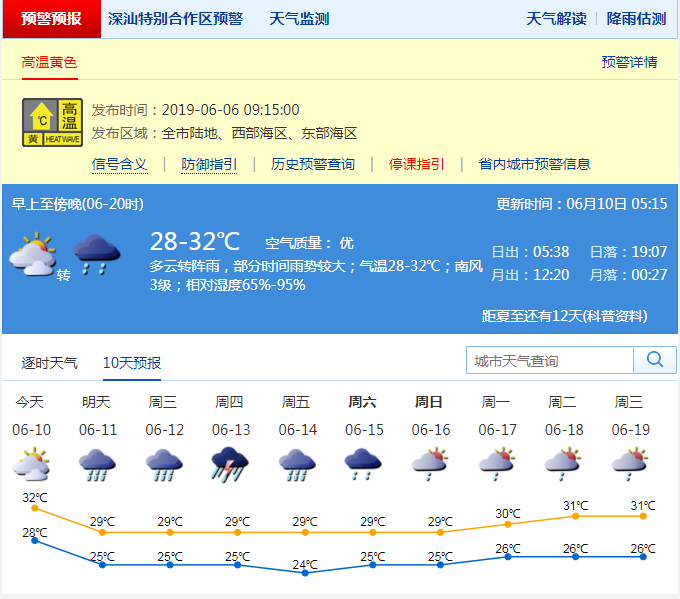 深圳新聞網(wǎng)2019年6月10日訊 在近幾日副熱帶高壓的影響下,深圳迎來(lái)了久違的“深圳藍(lán)”。不過(guò),市民們?cè)谙硎芡ㄍ傅乃{(lán)天夏日的同時(shí),也承受著不斷升溫的“燒烤模式”。2019年6月6日上午09時(shí)15分深圳市氣象臺(tái)發(fā)布了今年的首個(gè)高溫黃色預(yù)警信號(hào),2019年6月9日羅湖區(qū)東門自動(dòng)站記錄到36.2℃高溫。氣溫圖上一片橙色紅色,簡(jiǎn)直成了一只“紅燒雞腿”。