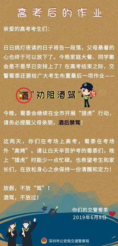 深圳新聞網(wǎng)2019年6月10日訊(記者 高暢韻)高考圓滿結(jié)束,很多有考生的家庭做的第一件事,就是帶上家人朋友聚聚餐,犒勞一下孩子跟自己。但放假不放“駕”,孩子們有努力完成考試,父母?jìng)?span style="text-indent: 32px;">有乖乖地酒后不開車嗎?這不,高考結(jié)束當(dāng)晚,就有14只"醉貓"被抓獲······