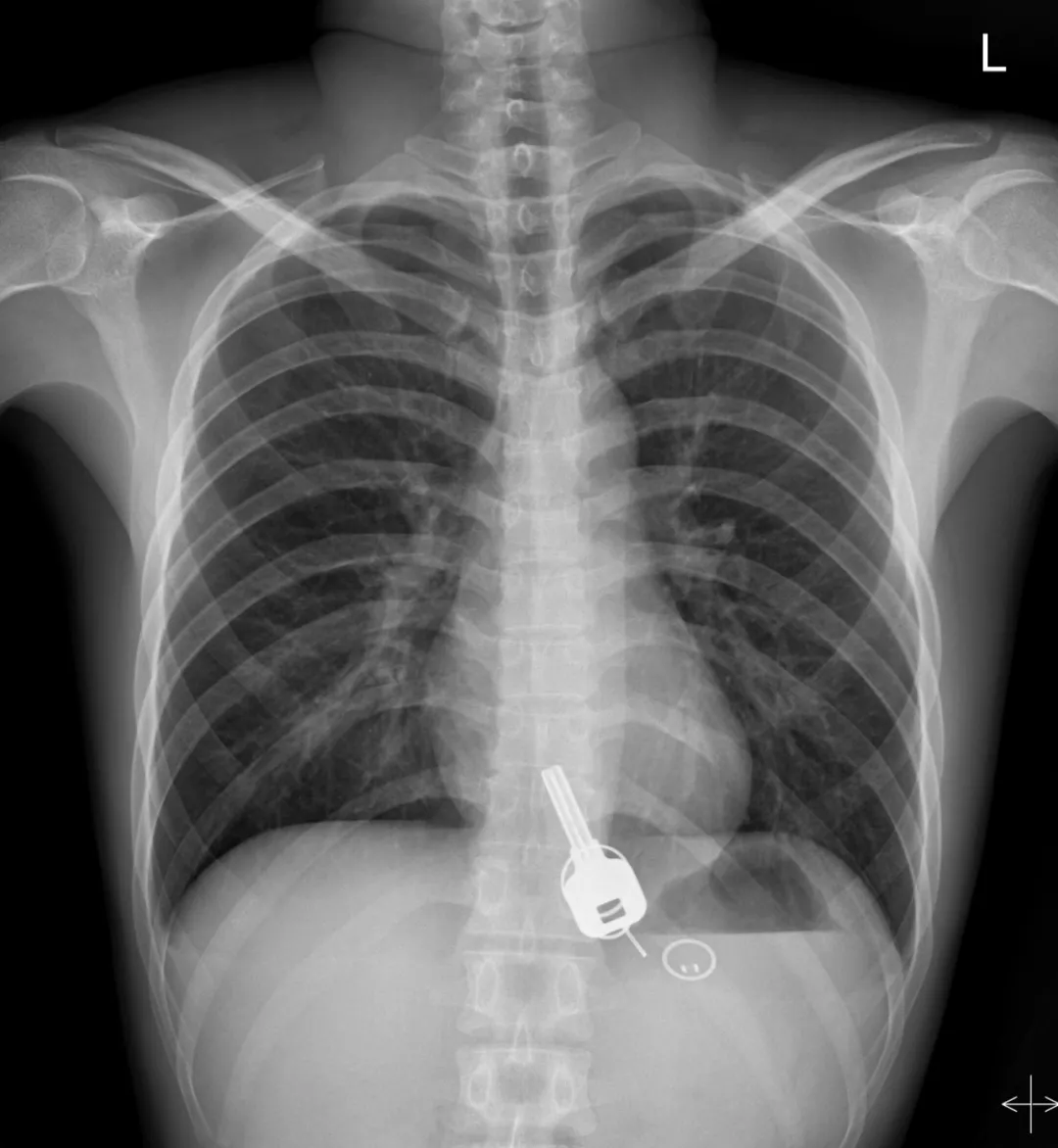 廣東東莞的常先生酒后回家找不到鑰匙,酒醒后他感到胸口疼痛,去醫(yī)院一查,發(fā)現(xiàn)一把鐵鑰匙、2個(gè)鑰匙扣、1個(gè)門禁牌清楚顯示在肚子胃區(qū)的位置上。