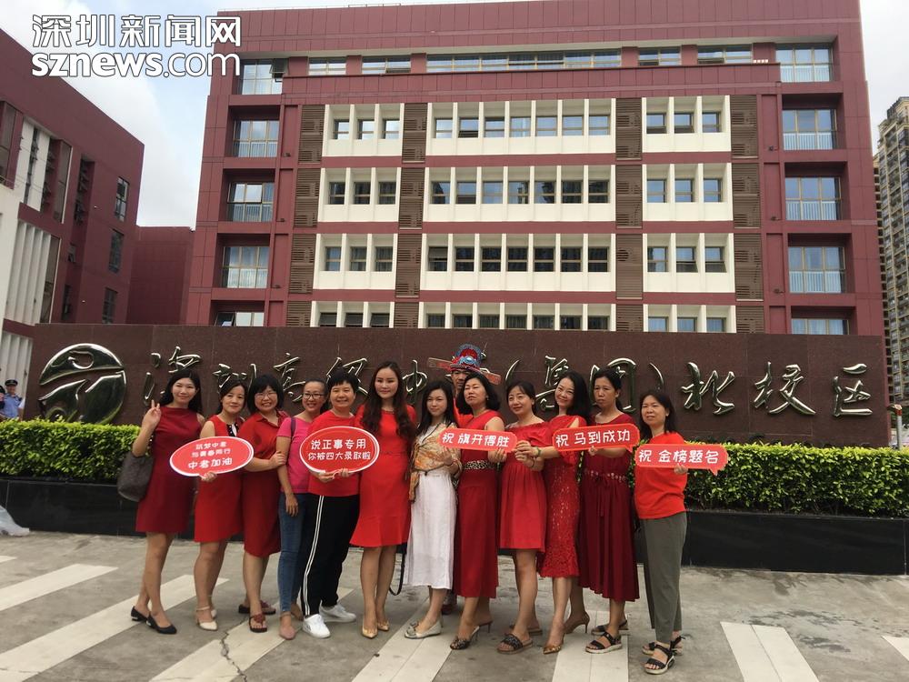 前來送考的家長在校外留影。