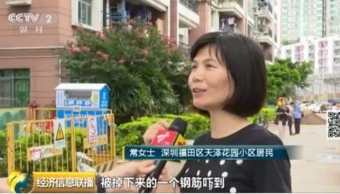 深圳福田區(qū)天澤花園小區(qū)居民常女士:我自己本人曾經(jīng)就在這下邊,被掉下來(lái)的一個(gè)鋼筋嚇到,當(dāng)時(shí)離這個(gè)鋼筋掉下來(lái)的位置就只有兩米遠(yuǎn)。
