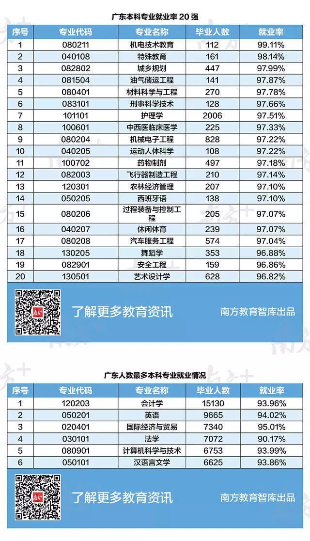 2018年廣東本科畢業(yè)生初次就業(yè)率為93.84%。就業(yè)率最高前20名中,屬工科類(lèi)的專(zhuān)業(yè)最多,有10個(gè)。