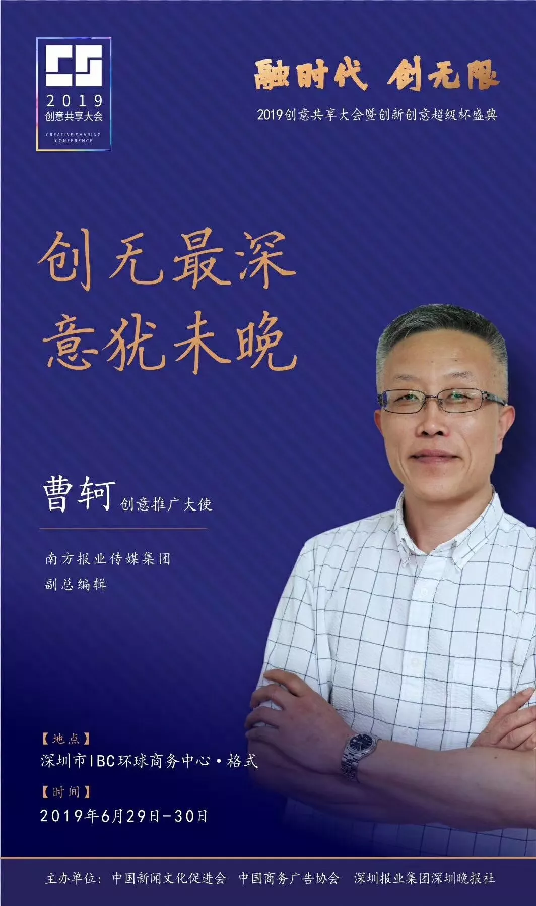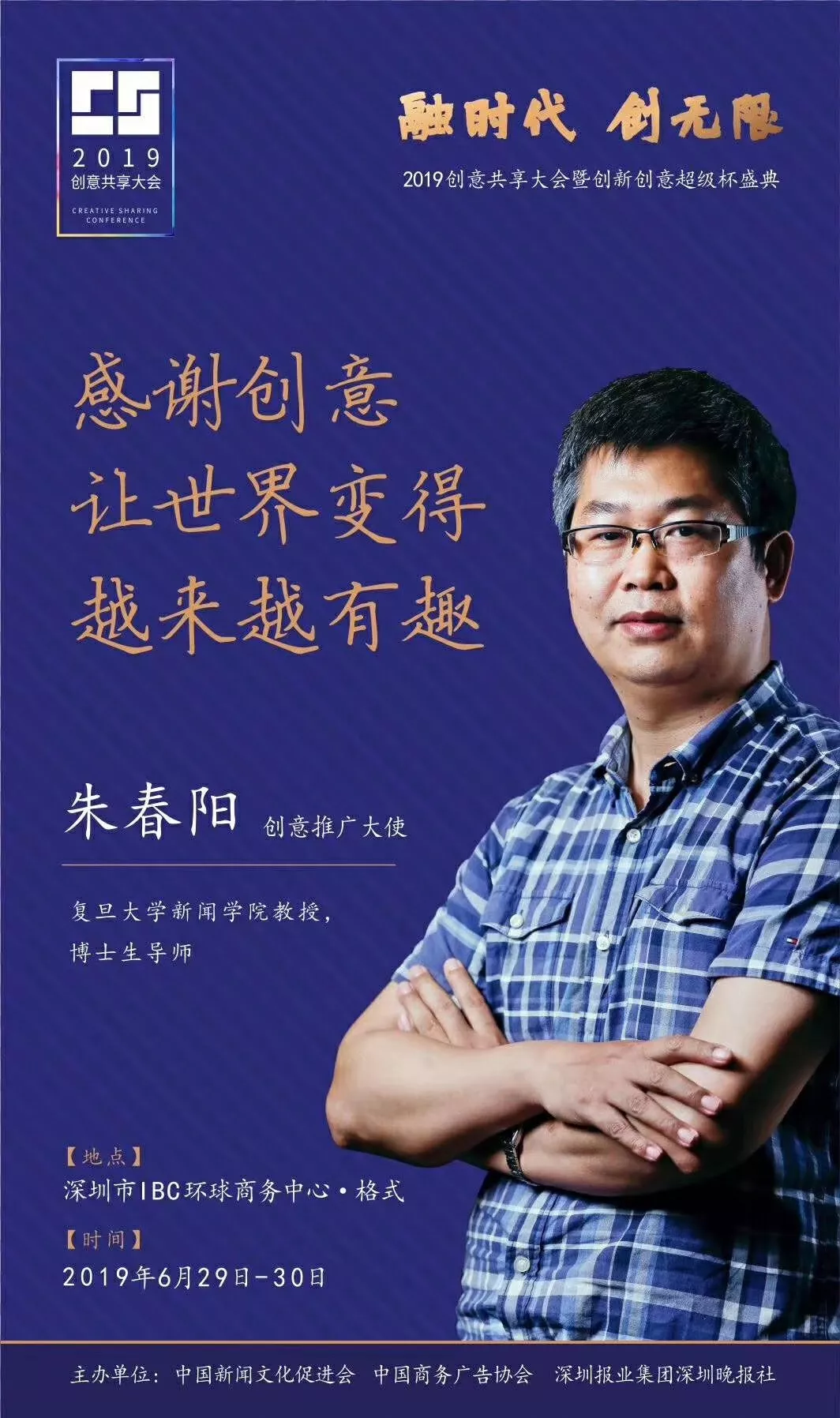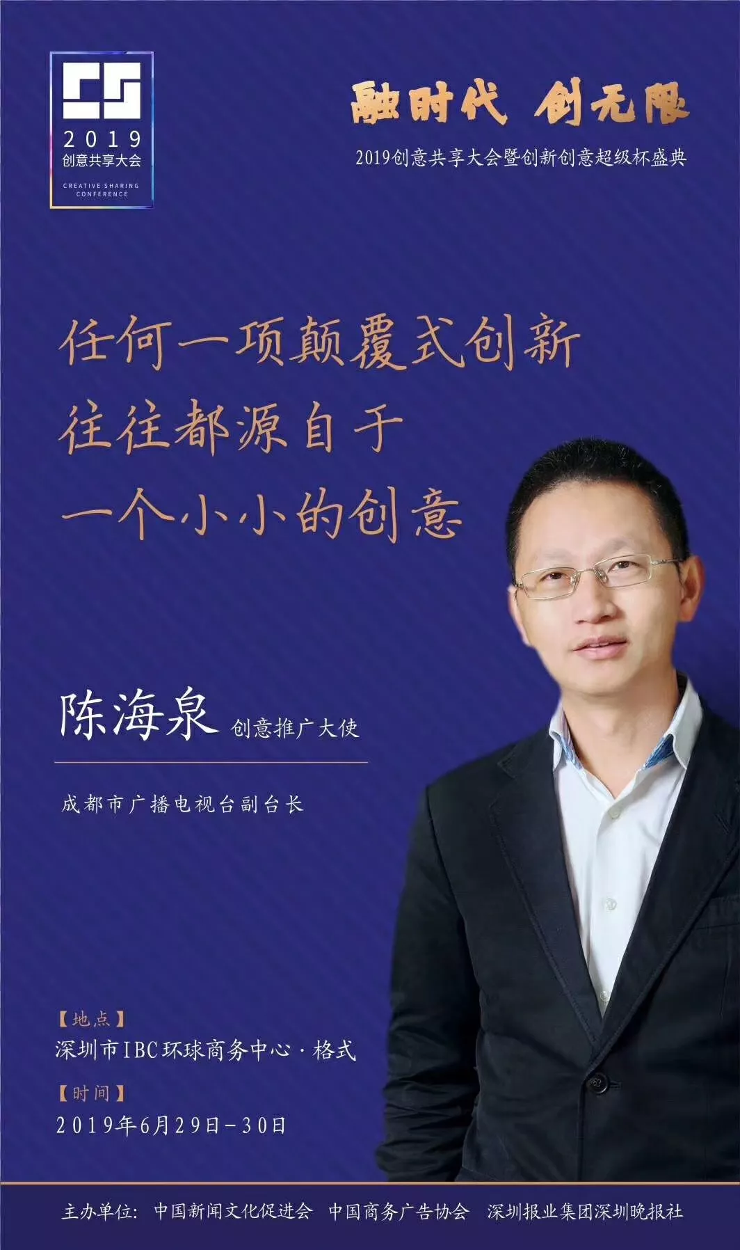 為了展現(xiàn)創(chuàng)意中國的精神風(fēng)貌和創(chuàng)意傳媒的文化力量,構(gòu)建創(chuàng)新創(chuàng)意共同體,擘畫美好圖景和未來趨勢,2019年6月29日至30日,由中國新聞文化促進(jìn)會(huì)、中國商務(wù)廣告協(xié)會(huì)、深圳報(bào)業(yè)集團(tuán)深圳晚報(bào)社等聯(lián)合主辦的“融時(shí)代創(chuàng)無限——2019創(chuàng)意共享大會(huì)暨創(chuàng)新創(chuàng)意超級杯盛典”將在深圳市IBC環(huán)球商務(wù)中心隆重舉辦。