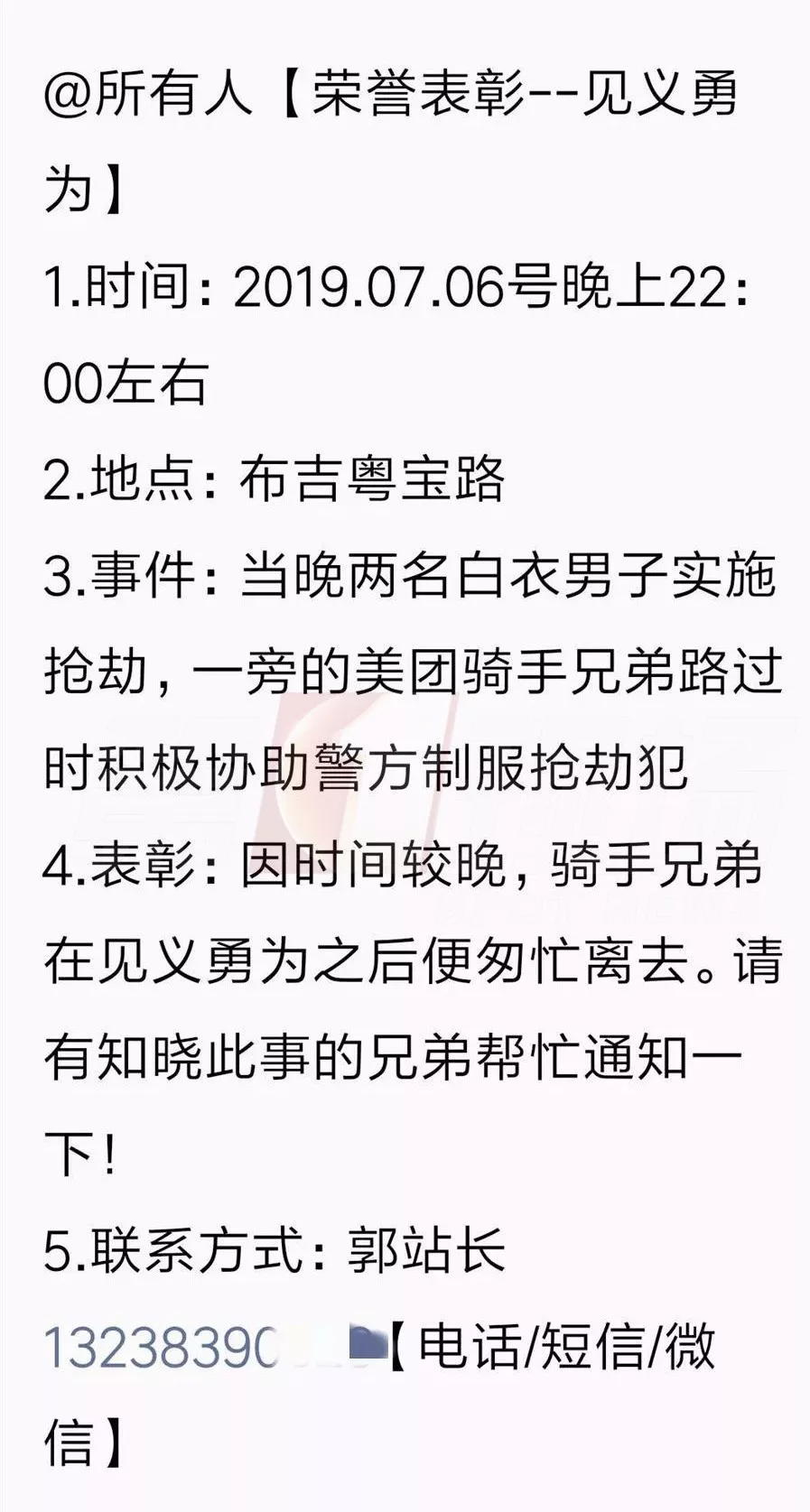 (美團公司員工群內尋人短信)