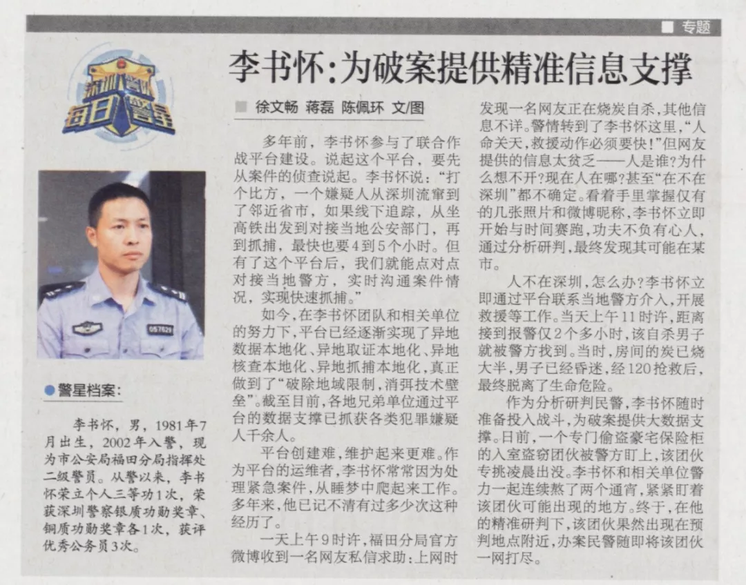 多年前,李書懷參與了聯(lián)合作戰(zhàn)平臺建設(shè)。說起這個平臺,要先從案件的偵查說起。李書懷說:“打個比方,一個嫌疑人從深圳流竄到了鄰近省市,如果線下追蹤,從坐高鐵出發(fā)到對接當(dāng)?shù)毓膊块T,再到抓捕,最快也要4到5個小時。但有了這個平臺后,我們就能點對點對接當(dāng)?shù)鼐?,實時溝通案件情況,實現(xiàn)快速抓捕。”