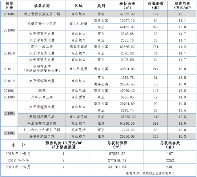 深圳預(yù)售均價(jià)10萬(wàn)元/㎡以上的樓盤(pán)(2018.1-2019.5)