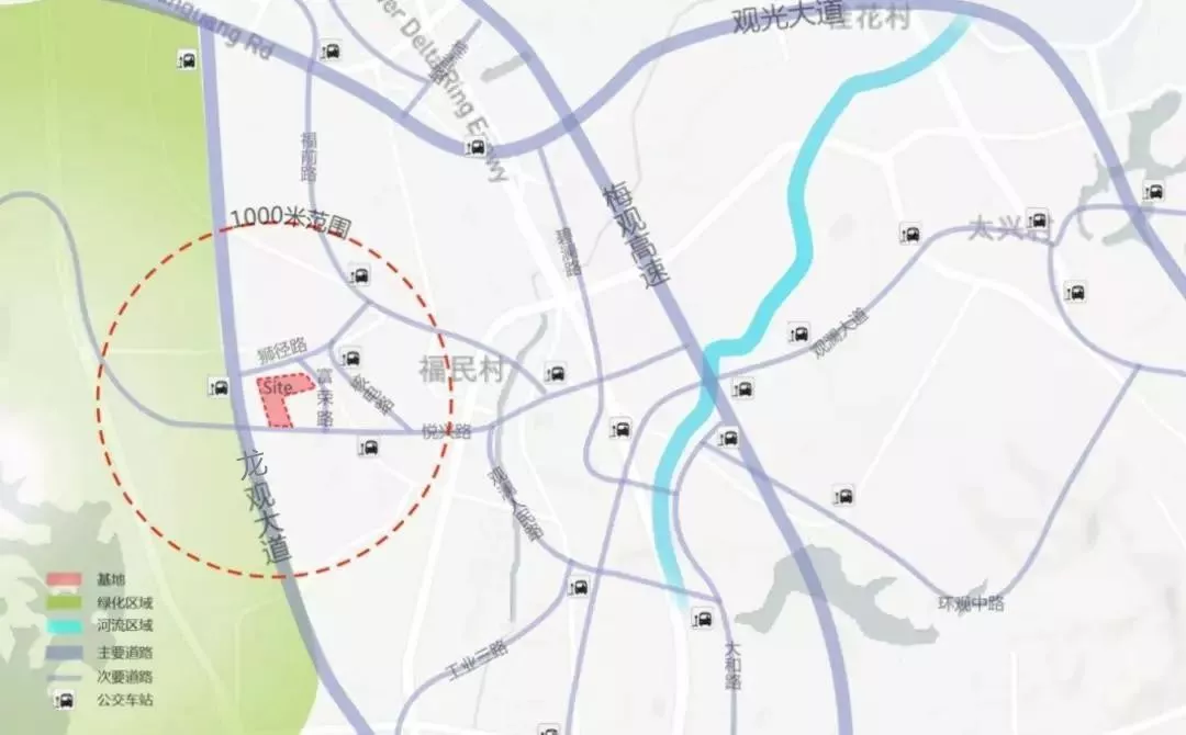 ▲項(xiàng)目西臨龍觀大道,南接悅興路,北接獅徑路,東接富榮路,交通便利。