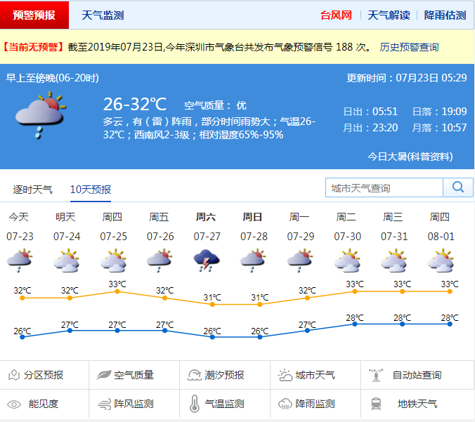 深圳新聞網(wǎng)2019年7月23日訊 市氣象局預(yù)計深圳23日多云為主,有(雷)陣雨,部分時間雨勢較大,局部地區(qū)雨量可達(dá)中到大雨量級;氣溫27-32℃,中午前后體感略顯悶熱;西南風(fēng)2-3級;相對濕度65%-95%。24-26日轉(zhuǎn)炎熱天氣,午后易激發(fā)熱對流性降雨,最高氣溫33-35℃;27-28日降雨增多,部分時間雨勢較大。