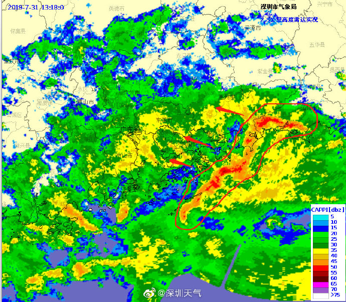 當(dāng)一條雨帶的長(zhǎng)軸和雨帶的移動(dòng)方向(箭頭)夾角很小時(shí),某個(gè)地方就會(huì)被這條雨帶幾乎從頭到尾地經(jīng)過,于是這個(gè)地方的累計(jì)雨量就會(huì)特別大。而現(xiàn)在深圳靠南的大部分區(qū)域就在經(jīng)歷一場(chǎng)列車效應(yīng),所以這場(chǎng)雨持續(xù)時(shí)間比較長(zhǎng),短時(shí)間內(nèi)停不下來。