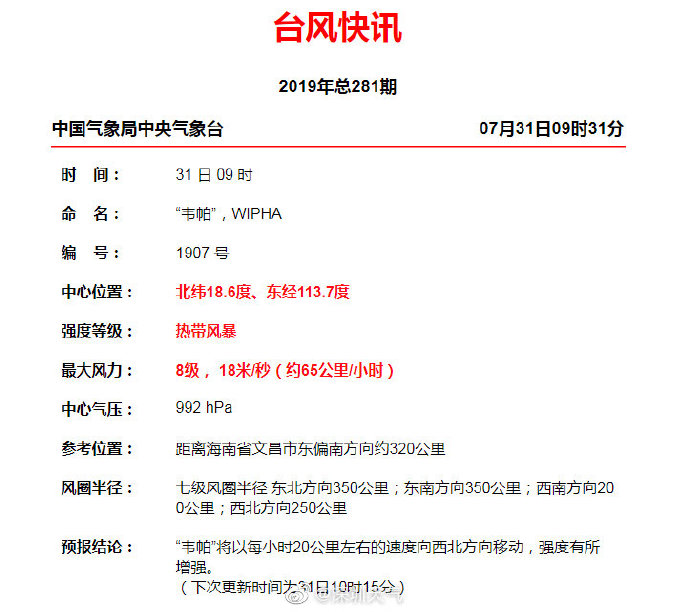 氣象部門預(yù)計(jì),未來24小時(shí)內(nèi)“韋帕”將以每小時(shí)15公里-20公里的速度向西北方向移動(dòng),強(qiáng)度略有加強(qiáng),將于8月1日早晨到上午,在茂名電白到海南瓊海一帶沿海地區(qū)登陸,正面襲擊雷州半島。登陸后將穿過雷州半島,移入北部灣。