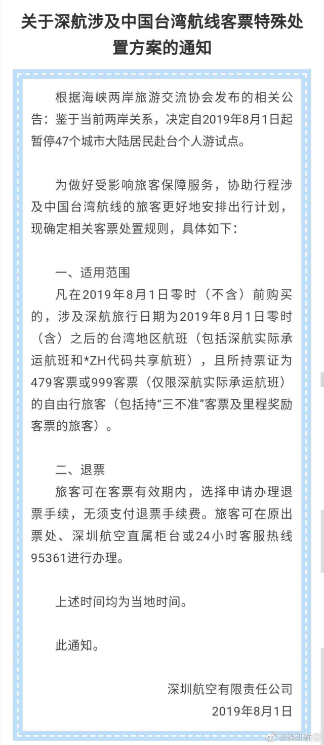 深圳航空剛剛率先發(fā)布了關(guān)于深航涉及中國臺灣航線客票特殊處置方案的通知,凡在2019年8月1日零時(不含)前購買的,涉及深航旅行日期為2019年8月1日零時(含)之后的臺灣地區(qū)航班(包括深航實際承運航班和*ZH代碼共享航班),且所持票證為479客票或999客票(僅限深航實際承運航班)的自由行旅客(包括持“三不準(zhǔn)”客票及里程獎勵客票的旅客),旅客可在客票有效期內(nèi),選擇申請辦理退票手續(xù),無須支付退票手續(xù)費。旅客可在原出票處、深圳航空直屬柜臺或24小時客服熱線95361進(jìn)行辦理。