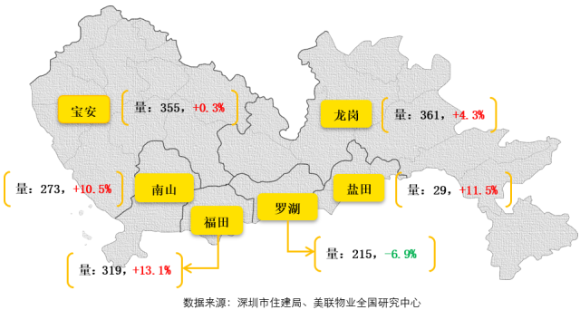 福田、南山、鹽田三個(gè)區(qū)成交套數(shù)環(huán)比均出現(xiàn)超過(guò)1成的增長(zhǎng);而但從成交套數(shù)來(lái)看,羅湖區(qū)的成交量在全市中僅高于一直較低的鹽田區(qū)。