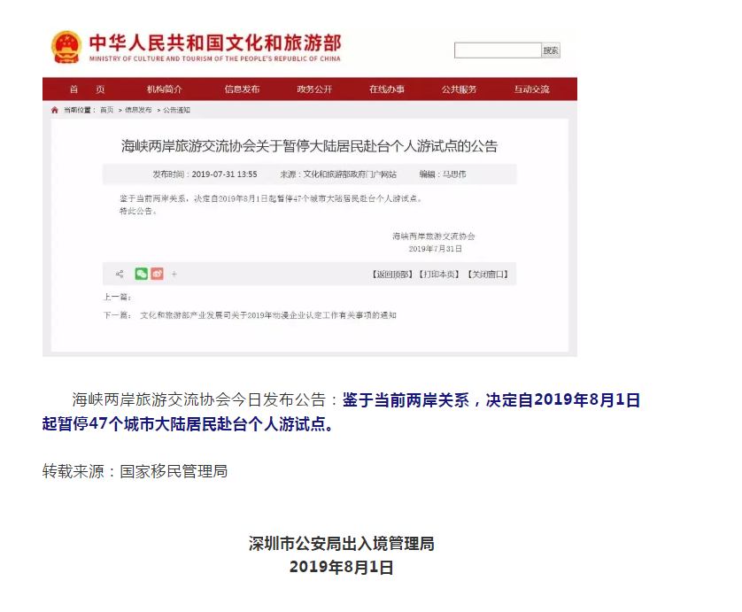 8月1日,暫停47個城市大陸居民赴臺個人游試點