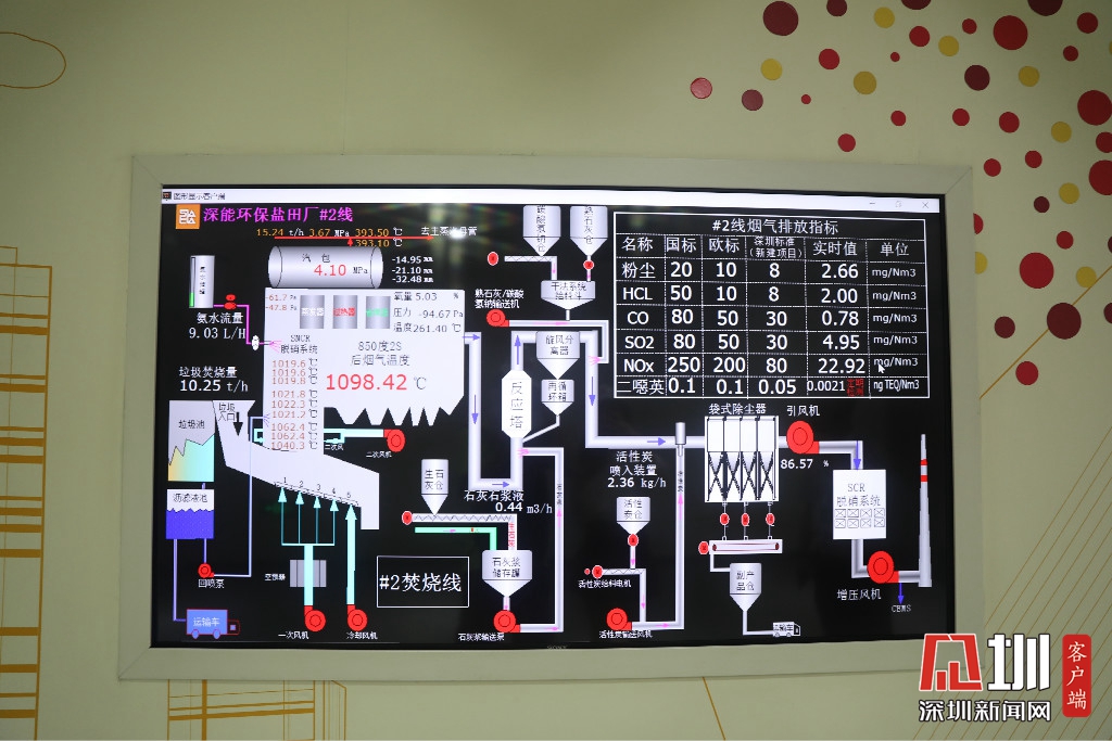 廠內(nèi)還設(shè)有煙氣指標(biāo)電子屏,屏上可以看到粉塵、氯化氫、一氧化碳等多項(xiàng)煙氣排放實(shí)時(shí)數(shù)值。據(jù)介紹,深圳實(shí)行的排放標(biāo)準(zhǔn)遠(yuǎn)遠(yuǎn)高于國家標(biāo)準(zhǔn)和歐盟標(biāo)準(zhǔn)。從發(fā)電廠外望去,從煙囪上方看不到一點(diǎn)煙霧。