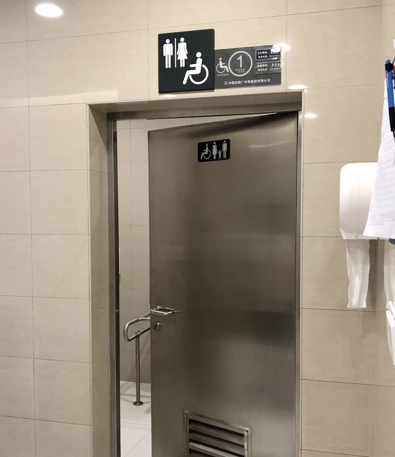 ▲同時記者留意到,在高鐵站沿路的洗手間指引標(biāo)識牌上,僅標(biāo)注了男女洗手間和殘疾人洗手間的標(biāo)識,卻沒有第三方洗手間的指引標(biāo)識,只有在殘疾人洗手間的門上才能看到“一家三口手拉手”的圖案標(biāo)識,不方便有需要的市民“按圖索驥”。且該洗手間位置處于男洗手間入口通道內(nèi),如果女性帶孩子進(jìn)入使用,不免有些尷尬。