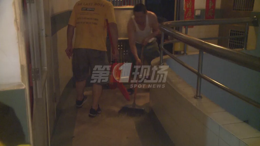 物業(yè)管理處人員正在清理樓道積水