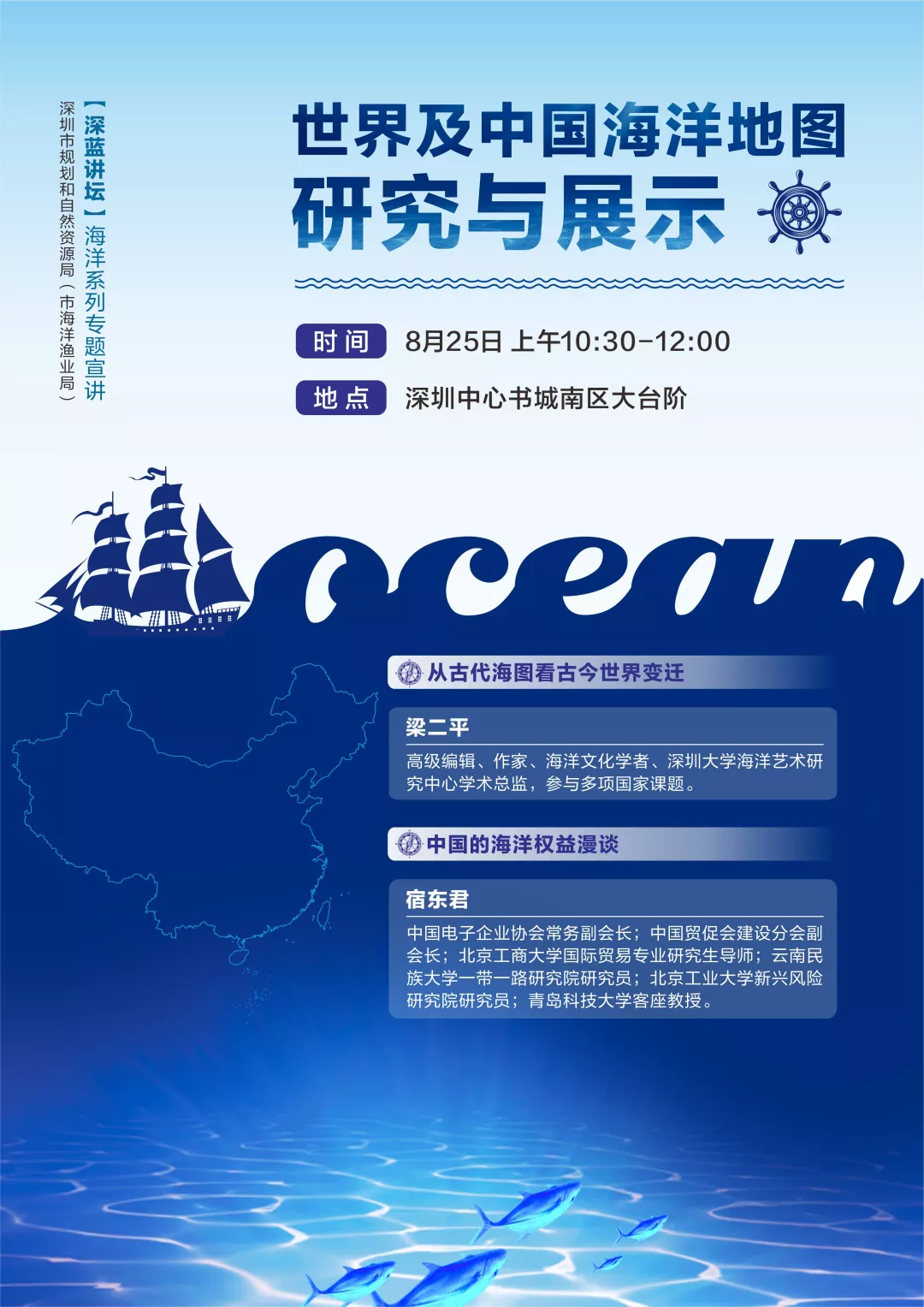 麥哲倫完成了第一次環(huán)球航行、哥倫布發(fā)現(xiàn)了新大陸、迪亞士最早探險至非洲最南端好望角、達伽馬開辟了通往印度的新航線…… 2000多年前,在茫茫大海上 裝備簡陋的航海者 取暖靠抖、通訊靠吼 沒有網(wǎng)絡(luò)、沒有手機、沒有GPS …… 卻能在廣闊無邊的大海中 找到心之所向的目的地 這是因為 他們有一張神奇的圖——海圖 梁二平:從古代海圖看古今世界變遷 世界上這一次又一次的航海大發(fā)現(xiàn),或者是由黃金、白銀、香料、瓷器、黑奴貿(mào)易等所引發(fā)的大侵略、大移民、大變革,都在一張小小的圖中展現(xiàn)得淋漓盡致。 大航海時代早期,西班牙、葡萄牙稱霸海洋,出盡了風頭,靠的就是海圖。后來英國擊敗荷蘭,意識到光靠戰(zhàn)爭是控制不了海洋的,更重要的是海洋知識。于是,英國設(shè)立了一個水文部,專門進行測量和制作海圖。這便是一代“海上霸主”崛起的關(guān)鍵。 每一幅海圖 都承載著豐富的地理、社會及歷史信息 不同時代、地域,不同文化背景下的海圖繪制者 對空間有著不同的理解 描繪世界的方式也有所不同 海圖一步一步從文字描述到精確標注 東西方海圖相互交融發(fā)展 為海洋變遷提供了真實的見證 一張小小的海圖 卻扮演著舉足輕重的“角色” 其實,它也和海洋權(quán)益 也有著密不可分的關(guān)系 宿東君:中國的海洋權(quán)益漫談 談及主權(quán)問題 我們總是滿懷著一腔熱血 看紀錄片時 海上時不時會漂浮著一個個小浮標 想知道小浮標對海洋科技考察有什么作用? 中國先驅(qū)又是如何歷盡艱難險阻 主張屬于中國的海洋權(quán)益的? 想知道引發(fā) 南海問題、釣魚島問題的“來龍去脈”嗎? 以上的種種疑問 都將在8月25日的“”深藍講壇” 一同為你揭曉! “深藍講壇” 2017年5月,《全國海洋經(jīng)濟發(fā)展“十三五”規(guī)劃》明確提出推進深圳建設(shè)全球海洋中心城市,在投融資、服務(wù)貿(mào)易、商務(wù)旅游等方面進一步提升對外開放水平和國際影響力,打造成為“21世紀海上絲綢之路”的排頭兵和主力軍;2018年9月,市委市政府印發(fā)《關(guān)于勇當海洋強國尖兵加快建設(shè)全球海洋中心城市的決定》及實施方案;2019年,深圳創(chuàng)建全球海洋中心城市納入到《粵港澳大灣區(qū)規(guī)劃發(fā)展綱要》和《關(guān)于支持深圳建設(shè)中國特色社會主義先行示范區(qū)的意見》。 為讓社會了解這一重要政策,計劃通過開展“深藍講壇”專題系列活動,通過專家講授、市民互動等活動,請市民對我市海洋發(fā)展政策、主要目標和實施路徑等建言獻策,在擴大影響面的同時收集好的意見和建議,以更好地推動我市海洋各項工作的順利開展,為我市創(chuàng)建全球海洋中心城市營造氛圍,奠定思想基礎(chǔ)。 現(xiàn)在,“深藍講壇”專題系列活動真的來了! 8月25日 以“世界及中國海洋地圖研究與展示”為主題 2019年首場“深藍講壇”海洋系列專題宣講活動 即將拉開帷幕