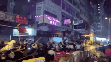④25日晚,激進示威者在荃灣沙咀道與警方發(fā)生沖突,一度向警員進逼,警方后退。危急之下,現(xiàn)場至少有3名警察拔槍,現(xiàn)場傳出槍聲。