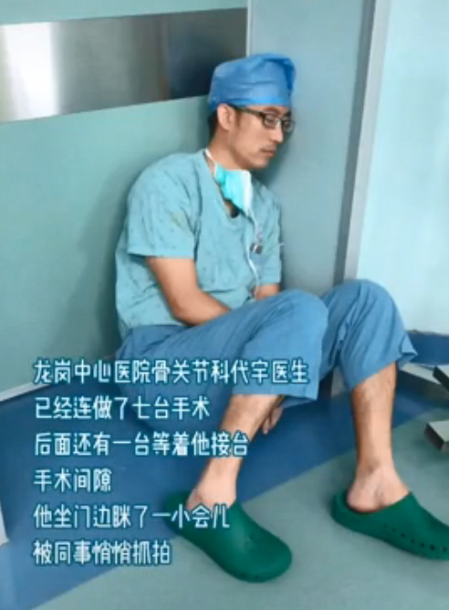 他連做7臺(tái)手術(shù),在第8臺(tái)手術(shù)開始前的間隙,靠著墻睡著了