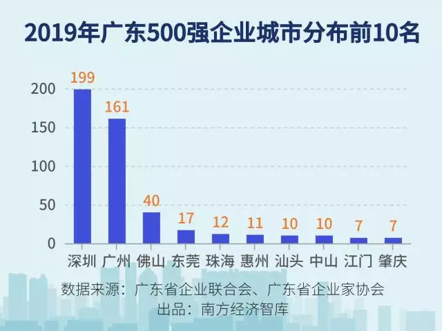 在這份榜單中,500家入選企業(yè)分布于廣東19個(gè)城市。其中,超過九成來自珠三角城市,前10強(qiáng)企業(yè)來自廣州、深圳、佛山三市,2018年?duì)I業(yè)收入超過1千億的21家企業(yè)同樣來自珠三角,其中深圳11家,廣州6家,佛山2家,珠海和惠州各有1家。