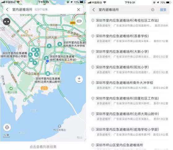 目前,深圳市已建成的592處室內(nèi)應(yīng)急避難場(chǎng)所位置信息已經(jīng)標(biāo)注在騰訊地圖上。深圳市民可在騰訊地圖APP端,或在“騰訊地圖+”微信小程序中,搜索“室內(nèi)應(yīng)急避難場(chǎng)所”,獲取附近所有室內(nèi)應(yīng)急避難場(chǎng)所的地理位置、名稱、地址、緊急聯(lián)系電話等信息,同時(shí)可一鍵導(dǎo)航,盡快抵達(dá)。