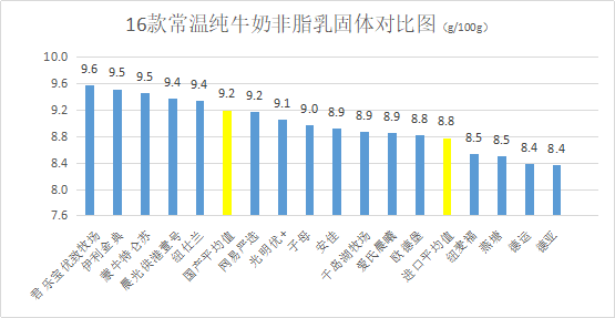 測(cè)評(píng)結(jié)果顯示:君樂寶優(yōu)質(zhì)牧場(chǎng)、伊利金典、蒙牛特侖蘇非脂乳固體含量排前三,8款國(guó)產(chǎn)牛奶非脂乳固體平均值9.2g/100g,8款進(jìn)口牛奶非脂乳固體平均值8.8g/100g,均高于國(guó)標(biāo)要求,國(guó)產(chǎn)牛奶表現(xiàn)優(yōu)于進(jìn)口牛奶。