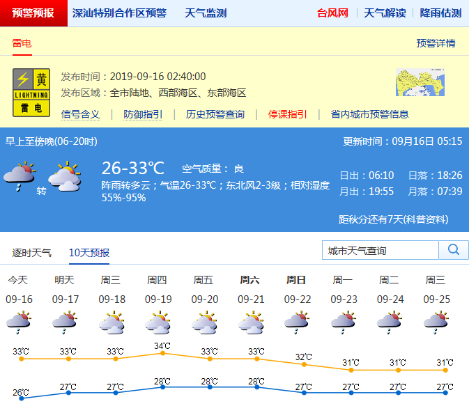 見圳客戶端·深圳新聞網(wǎng)2019年9月16日訊 深圳市氣象臺預(yù)計(jì),周一我市多云,有短時(shí)(雷)陣雨,部分時(shí)間雨勢稍大,氣溫26-33℃;周二至周日多云到晴天,天氣趨于悶熱,午后局地有短時(shí)陣雨。