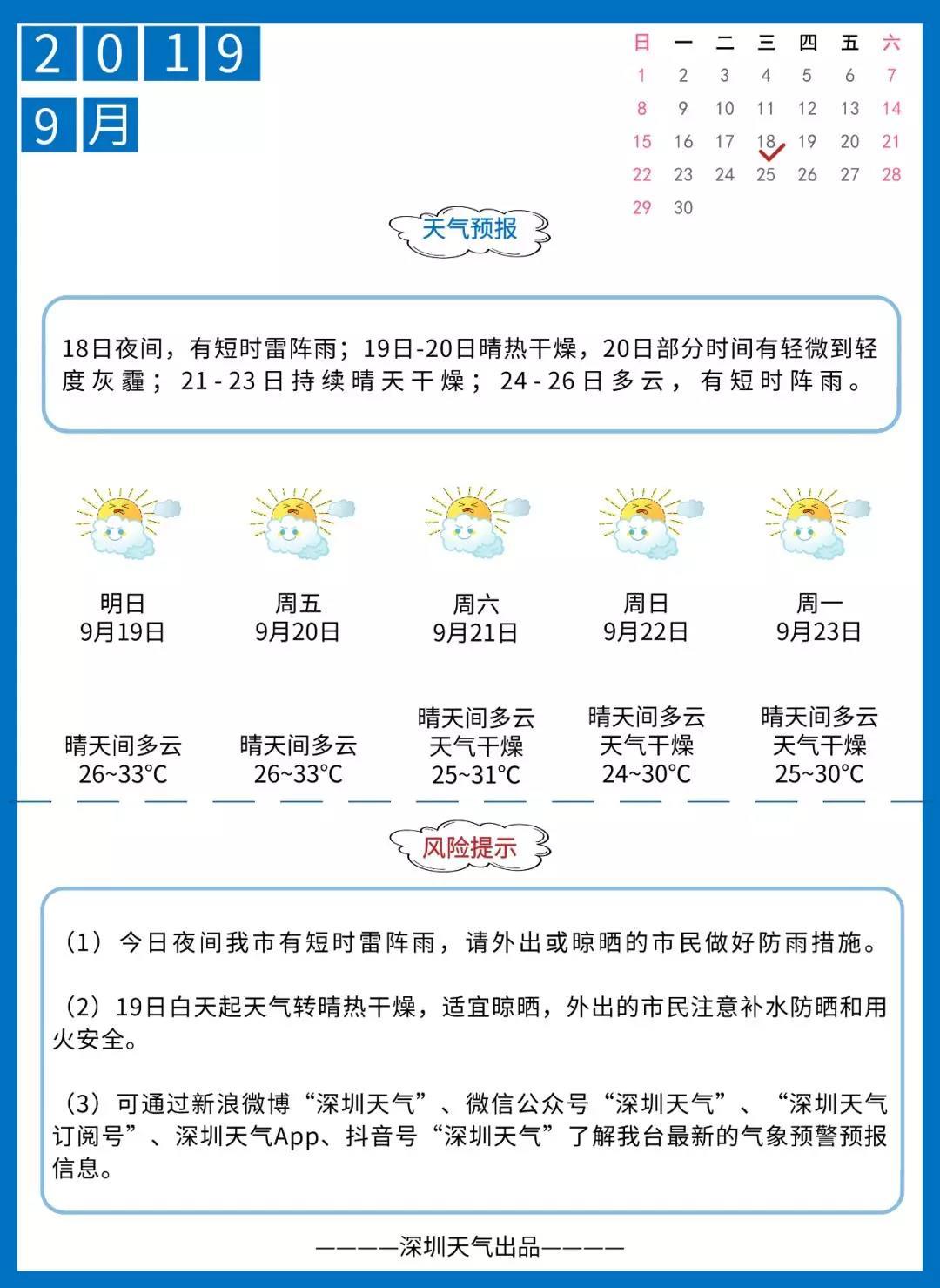 預(yù)計18日夜間有短時雷陣雨,19-20日天氣晴熱干燥,氣溫在26-33℃,20日部分時間有輕微到輕度灰霾,21-23日持續(xù)晴天干燥,24-26日多云,有短時陣雨。深圳天氣提醒市民,今夜外出注意防范局地短時雷雨,明日起外出注意補(bǔ)水防曬和用火安全!