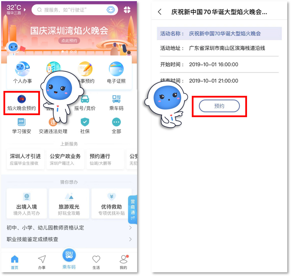 2.點擊首頁頂部圖片或焰火晚會預約入口進入預約頁面,點擊預約: