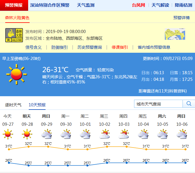 見圳客戶端·深圳新聞網(wǎng)2019年9月27日訊 深圳未來一周晴天間多云,陽光充足,天氣干燥,其中29-30日云量增加,濕度略有加大;10月初晴天間多云。