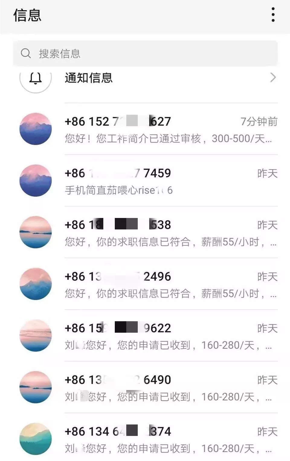 各種招聘電話以幾分鐘一個的頻率不斷打進來。其中不少號碼一再被提示為高風險號碼。