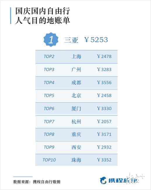 而哪些目的地在國(guó)慶期間最能吸引自由行游客?根據(jù)攜程自由行數(shù)據(jù),三亞、上海、廣州、成都、北京、廈門(mén)、杭州、重慶、西安和珠海。其中國(guó)慶前往三亞度假已經(jīng)成為潮流,單次人均花費(fèi)為5253元。
