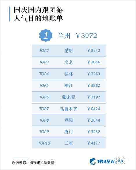 哪些國(guó)內(nèi)旅游城市是今年國(guó)慶的贏(yíng)家?根據(jù)攜程跟團(tuán)游,最受游客歡迎的國(guó)內(nèi)旅游城市前十分別是蘭州、昆明、北京、桂林、麗江、張家界、烏魯木齊、貴陽(yáng)、廈門(mén)和三亞。其中前往蘭州人均花費(fèi)近4000元。