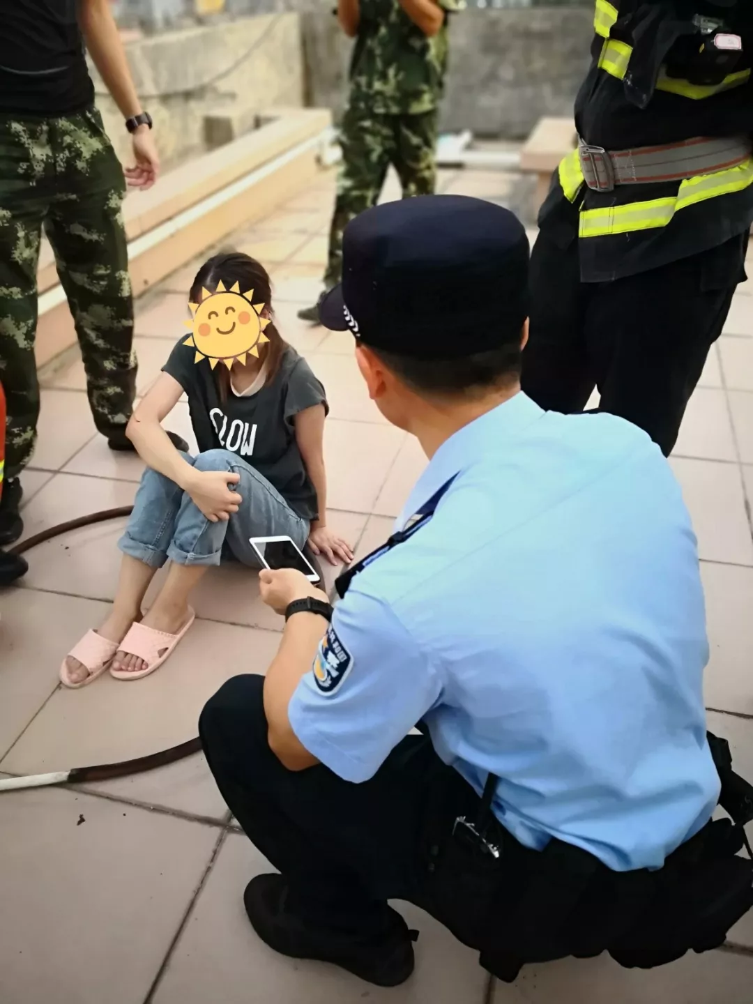 近日,深圳市公安局福田分局沙頭派出所接到群眾求助電話稱,其朋友疑似醉酒欲輕生。接警后,民警盧建明在5分鐘內(nèi)迅速趕到現(xiàn)場,發(fā)現(xiàn)當事人梁女士坐在樓頂圍墻上啼哭,多次嘗試與梁女士溝通后都沒有得到回復。但梁女士對盧建明很是信任,把手機信息給盧建明查看。盧建明得知梁女士因感情受挫產(chǎn)生輕生想法,撥打其男友電話卻始終聯(lián)系不上。盧建明擔心其長時間哭泣身體承受不住,容易發(fā)生意外,便采取強制救助措施。自己在前與梁女士交談分散她的注意力,安排隊員從后面將她救助到安全地方,并將她帶到社區(qū)工作站,在耐心的交談中解開她的心結,讓她放下包袱,重新生活。