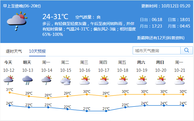 見(jiàn)圳客戶(hù)端·深圳新聞網(wǎng)2019年10月12日訊 據(jù)深圳市氣象臺(tái)消息,今日深圳多云,有輕微至輕度灰霾,午后至夜間轉(zhuǎn)陣雨,并伴有短時(shí)雷暴;氣溫24-31℃;偏東風(fēng)2-3級(jí);相對(duì)濕度65%-100%