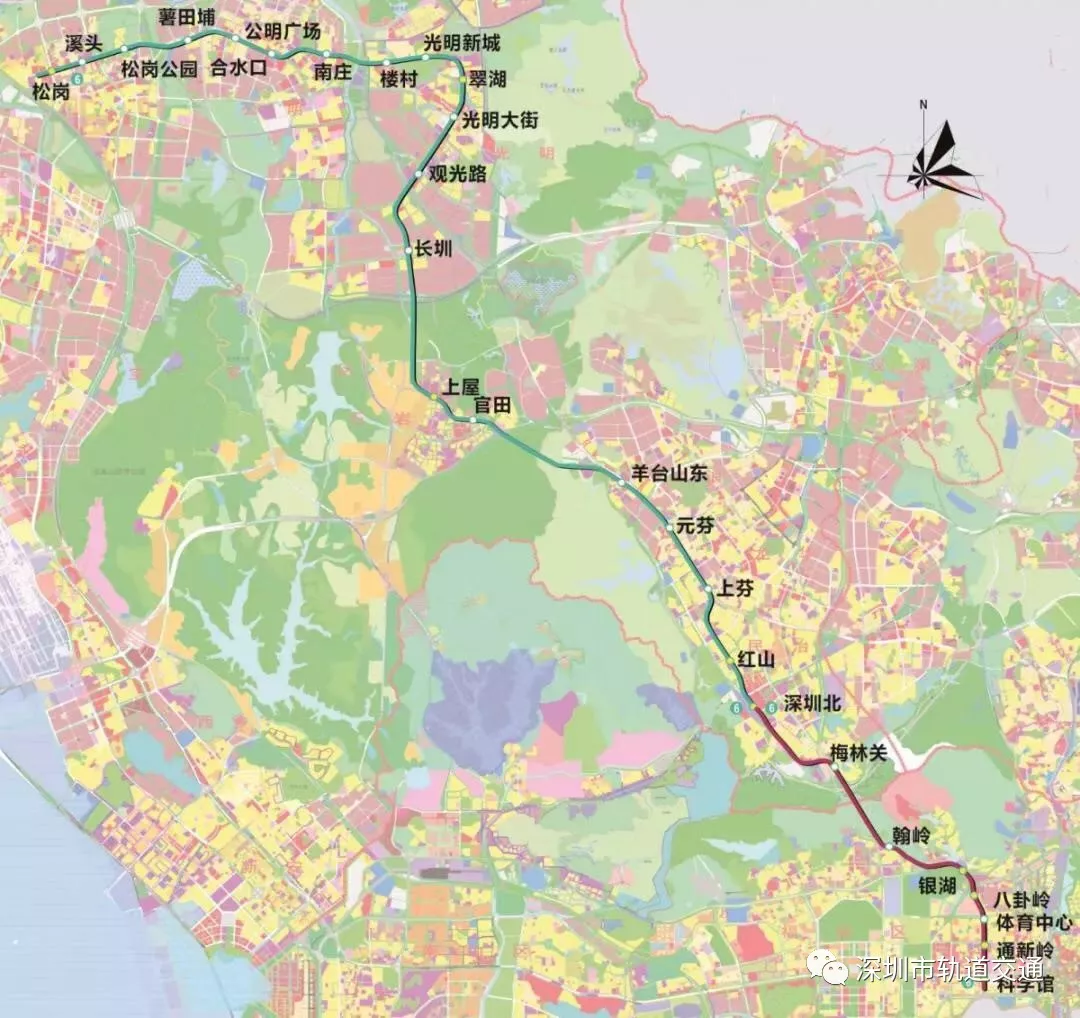 站點:科學館、通新嶺、體育中心、八卦嶺、銀湖、翰嶺、梅林關(guān)、深圳北、紅山、上芬、元芬、羊臺山東、官田、上屋、長圳、觀光路、光明大街、翠湖、光明新城、樓村、南莊、公明廣場、合水口、薯田埔、松崗公園、溪頭、松崗