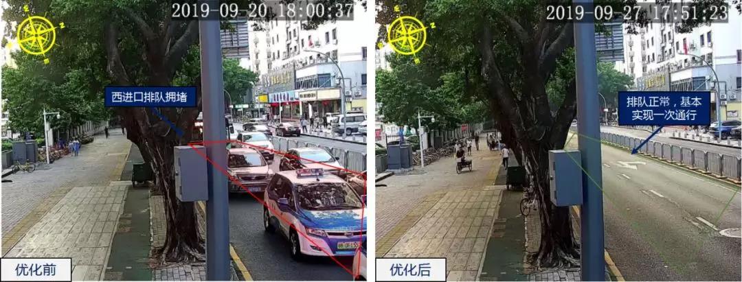 梅華/梅村路口位于梅林片區(qū),周邊商業(yè)住宅小區(qū)密集,早晚高峰通勤需求大。為保障行人過街安全,7月份以來,路口加裝了控右箭頭信號燈,同時(shí)為了解決人車交織問題,增加了行人專用相位,由于相位增多周期上升,相應(yīng)的右轉(zhuǎn)車輛通行效率會(huì)有所降低,導(dǎo)致高峰期出現(xiàn)東行排隊(duì)較長的情況。