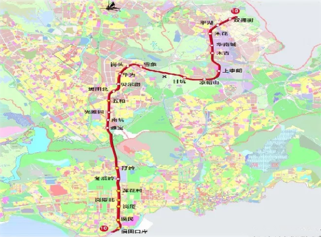站點(diǎn):福田口岸、福民、崗廈、崗廈北、蓮花村、冬瓜嶺、孖嶺、雅寶、南坑、光雅園、五和、坂田北、貝爾路、華為、崗頭、雪象、甘坑、涼帽山、上李朗、木古、華南城、禾花、平湖、雙擁街
