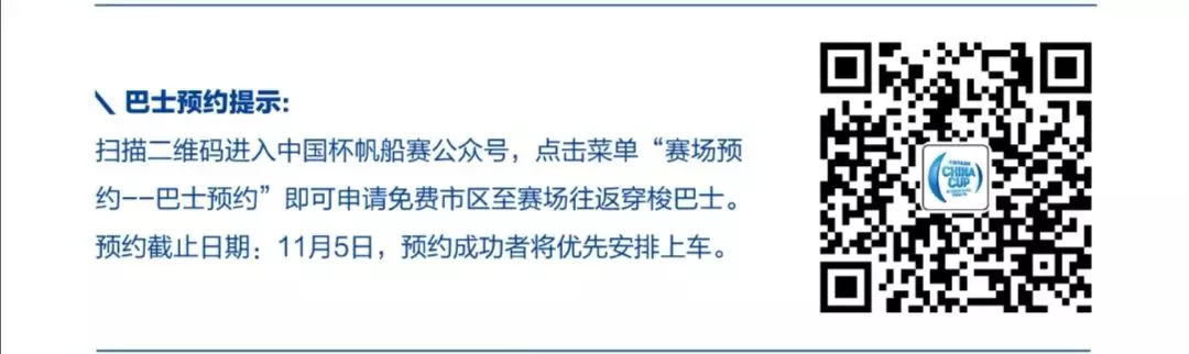 掃描二維碼進入中國杯帆船賽公眾號,點擊菜單“賽場預(yù)約-巴士預(yù)約”,即可申請免費市區(qū)至賽場往返穿梭巴士。預(yù)約截止日期:11月5日,預(yù)約成功者將優(yōu)先安排上車。