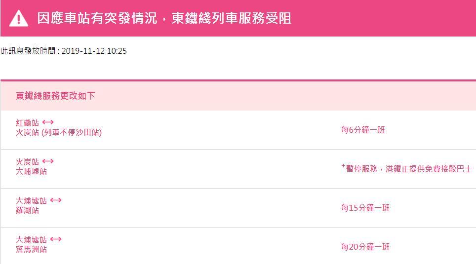 據(jù)港鐵官網(wǎng)目前最新消息,東鐵線列車運(yùn)營服務(wù)調(diào)整為:紅磡站至火炭站每6分鐘一班;火炭站至大埔墟站暫停服務(wù);大埔墟站至羅湖站每15分鐘一班;大埔墟站至落馬洲站每20分種一班。港鐵其他線路也有多處調(diào)整。