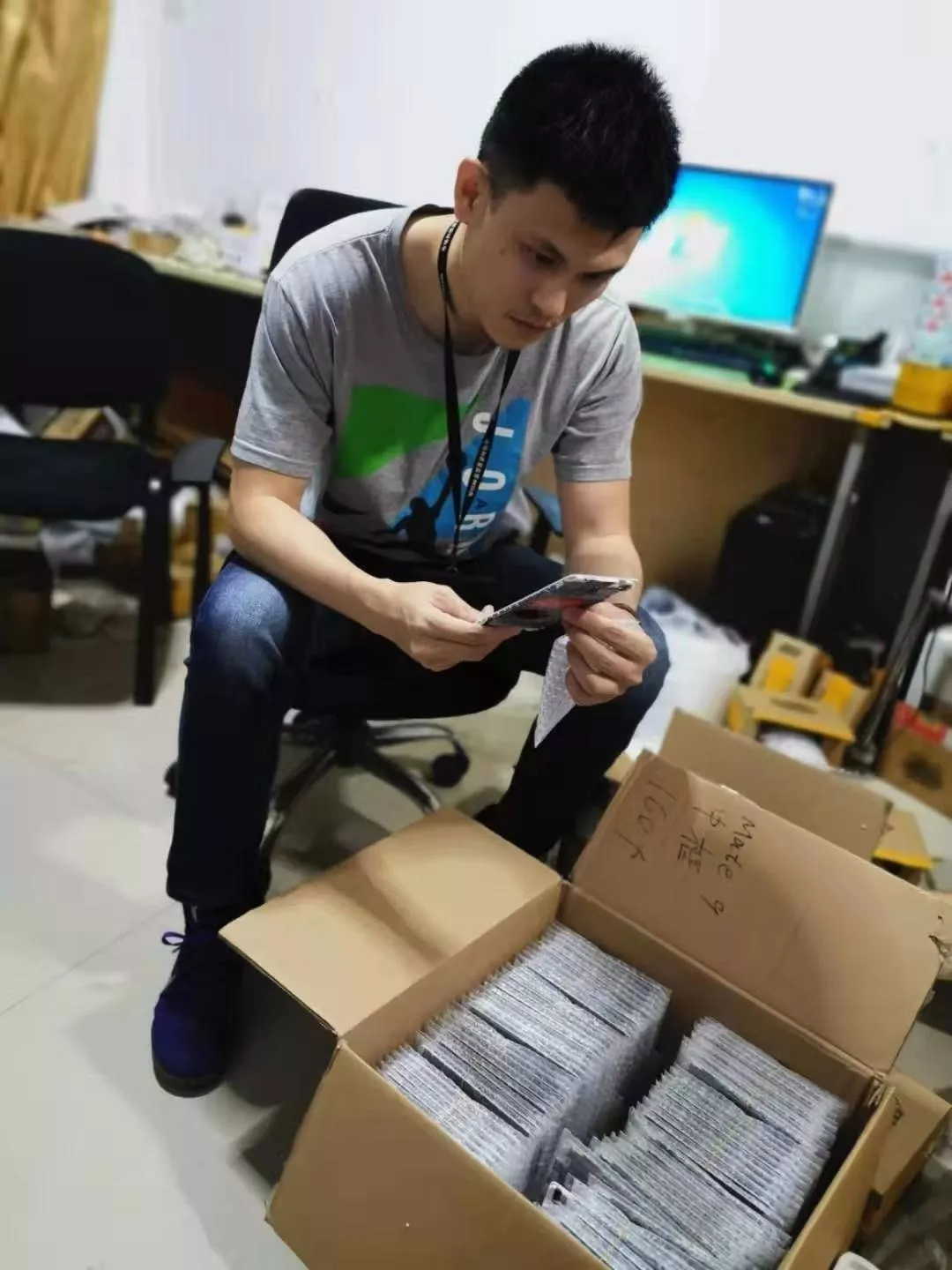 對(duì)電商平臺(tái)網(wǎng)店“深圳市尤信達(dá)包裝印刷有限公司”位于深圳市福田區(qū)華強(qiáng)北街道華美大廈某倉(cāng)庫(kù)窩點(diǎn)進(jìn)行了突擊檢查,執(zhí)法人員現(xiàn)場(chǎng)發(fā)現(xiàn)一大批侵犯華為注冊(cè)商標(biāo)各類包裝材料,各種手機(jī)零配件包裝材料堆滿了整個(gè)場(chǎng)所,現(xiàn)場(chǎng)只留有勉強(qiáng)一人通行的過(guò)道,經(jīng)現(xiàn)場(chǎng)清點(diǎn)共323箱,品類涉及有各種零件包裝盒、合格證及防偽標(biāo)簽。