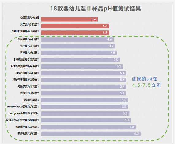 有3款樣品pH值呈偏酸性,低于皮膚的pH值(4.5-7.5),可能會(huì)傷害寶寶的皮膚。分別是怡恩貝手口濕巾、子初洋甘菊嬰兒手口柔棉巾、貝親嬰兒手口濕巾。