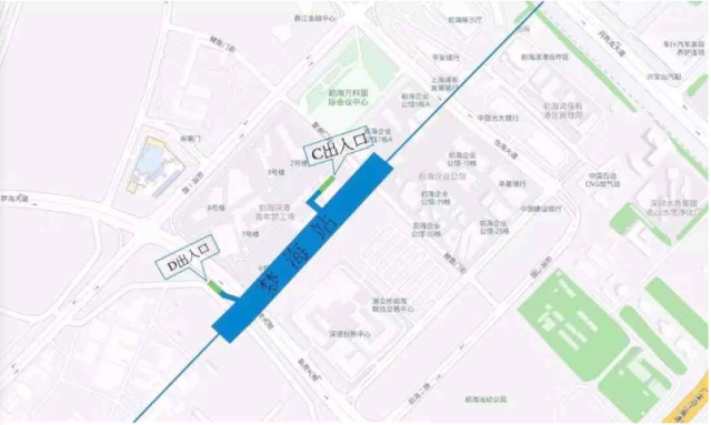 怡海站位于怡海大道與月亮灣大道中間,車站出入口共計4個,B、D出入口預(yù)留,A出入口接光大銀行,連接怡海大道,C出入口前海展廳旁,連接A號公路