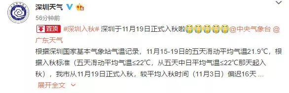 根據(jù)深圳國家基本氣象站氣溫記錄,11月15-19日的五天滑動(dòng)平均氣溫21.9℃,根據(jù)入秋標(biāo)準(zhǔn)(五天滑動(dòng)平均氣溫≤22℃,從五天中日平均氣溫≤22℃那天起入秋),我市從11月19日正式入秋,較平均入秋時(shí)間(11月3日)偏遲16天。
