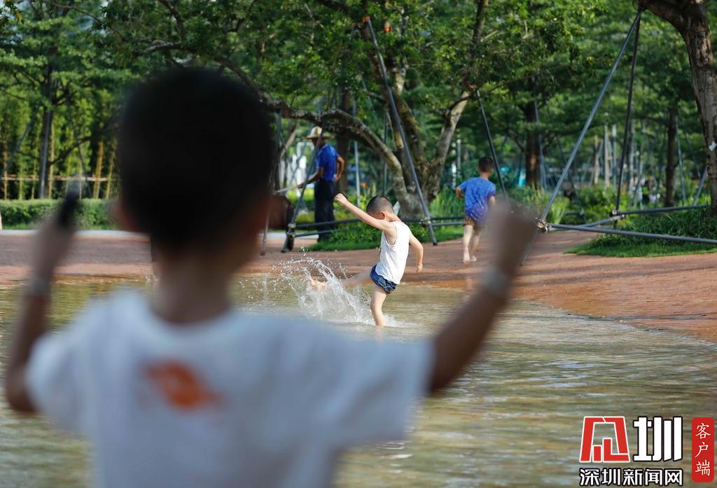 2019年8月23日,福田區(qū)中心書城。連日高溫后的一場降雨,一位小孩子在路邊的水坑玩水。