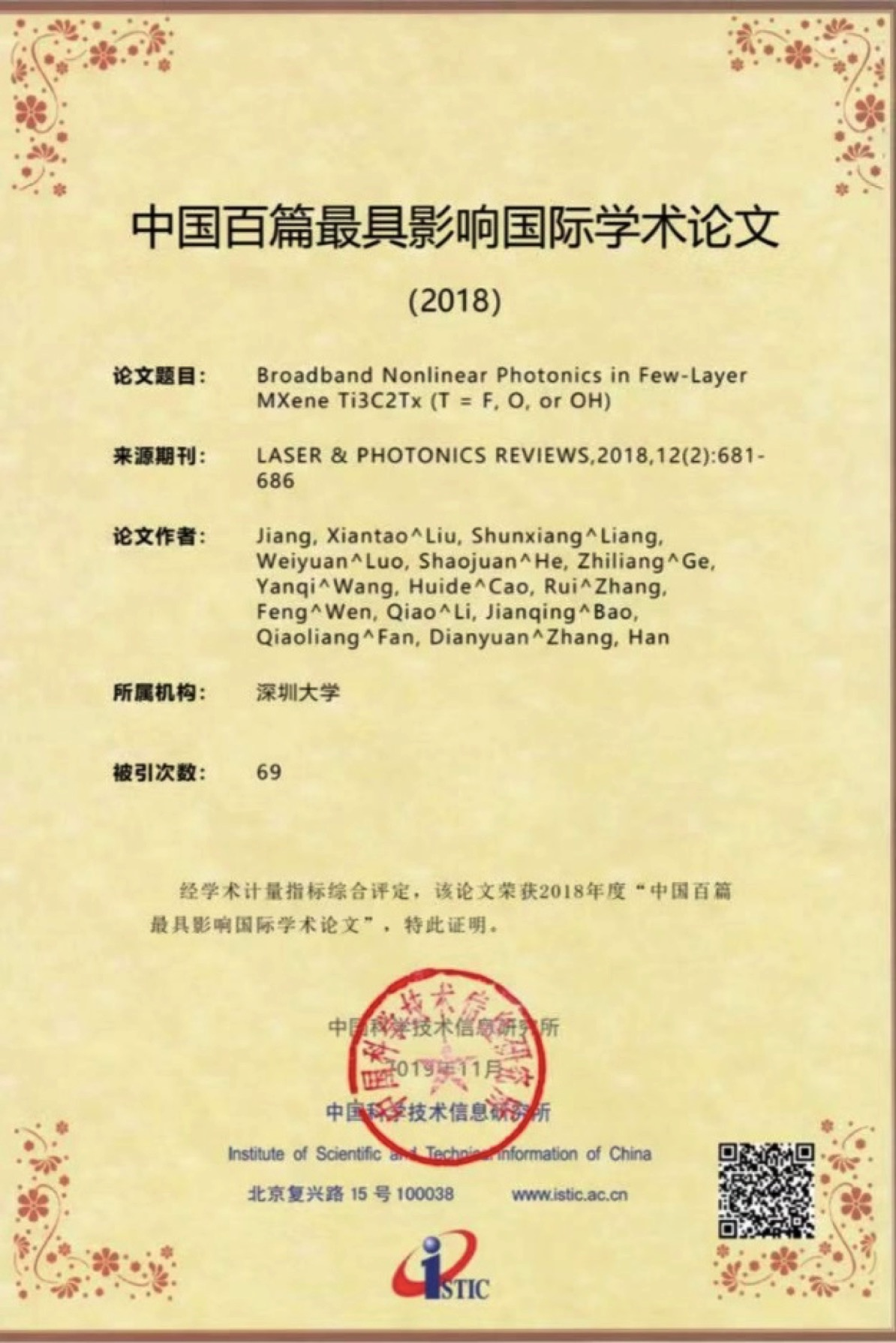 深圳特區(qū)報2019年11月22日訊 11月19日,中國科學(xué)技術(shù)信息研究所在北京召開中國科技論文統(tǒng)計結(jié)果發(fā)布會,公布了2018年中國百篇最具影響國際學(xué)術(shù)論文。深圳大學(xué)張晗教授課題組2篇論文入選,深大入選數(shù)量在中國內(nèi)地高校和研究機構(gòu)中并列第10。