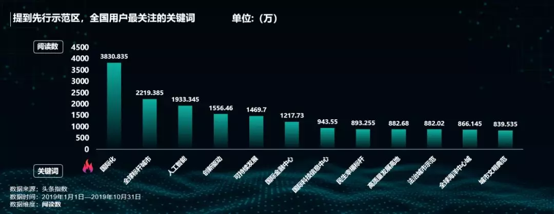 數(shù)據(jù)顯示,提到先行示范區(qū),全國網(wǎng)友最關(guān)注的關(guān)鍵詞是“國際化”,“全球標桿城市”其次,更有有意思的是,榜單多次出現(xiàn)“國際”、“全球”、“中心”等字眼,這表明全國網(wǎng)友對深圳未來將越來越國際化這一動向極為關(guān)注。