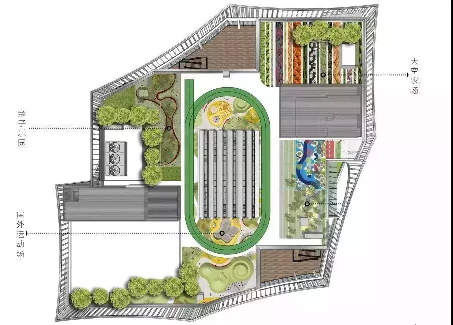 屋頂農(nóng)場(chǎng)充分利用空間,打造天空農(nóng)場(chǎng)、親子樂園、屋外運(yùn)動(dòng)場(chǎng)??罩械呐艿溃饰值耐寥?,瓜果蔬菜的金色豐收,讓自然在城市落地生根。小朋友們可以在其中,種植汗水,開花結(jié)果,收獲自然的饋贈(zèng)。